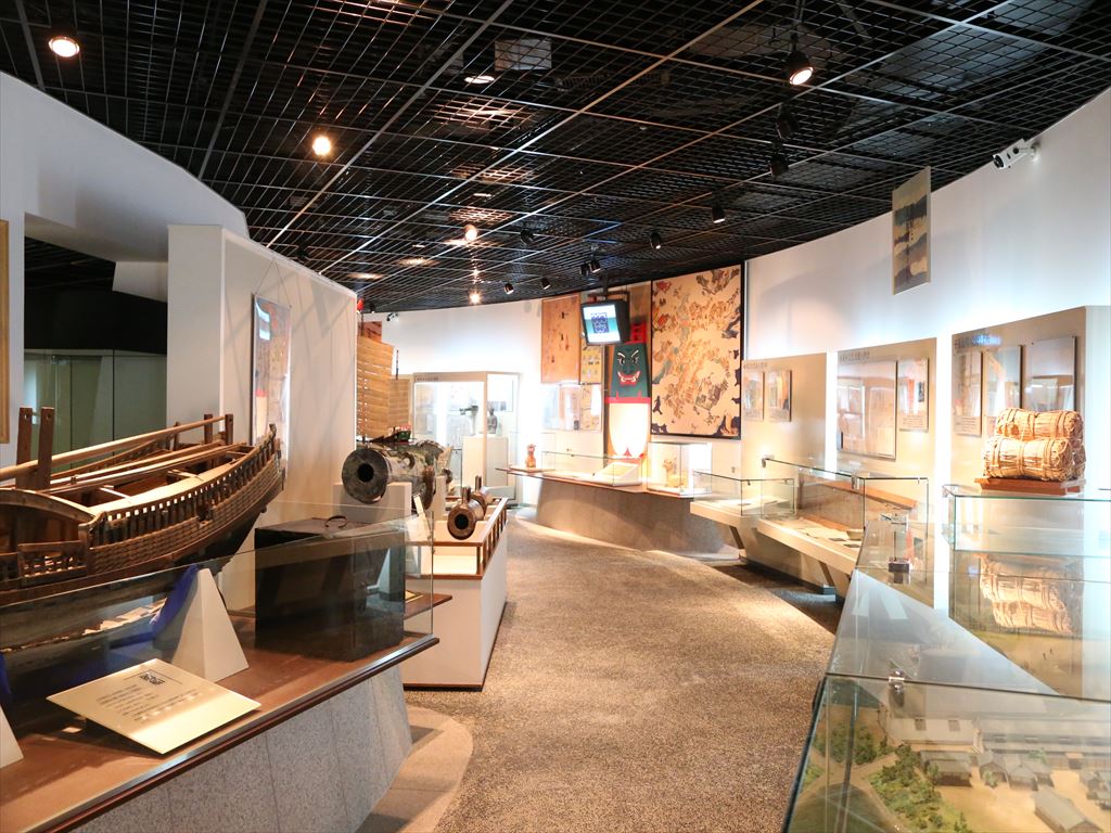 本館常設展示では「古代」「中世」「近世」の三部に分かれ、「古代」では九州で多く見られる内部の壁や石棺に浮き彫り、線刻、彩色が施された「装飾古墳」の模型や舟形石棺などの展示が、「中世」では唐船の模型など海外との貿易で栄えた歴史が展示されています。最後に「近世」では江戸時代、年貢米の集積地として栄えた歴史から明治の「西南戦争」までの展示がされています。