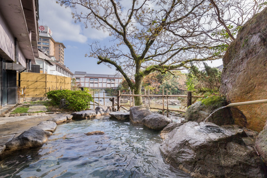 岩を積み重ねて作られた露天風呂「浮世風呂」は、手入れの行き届いた日本庭園の中にあり、すぐそばに流れる嬉野川のせせらぎを聞きながらゆったりとした時間を楽しむことができます。