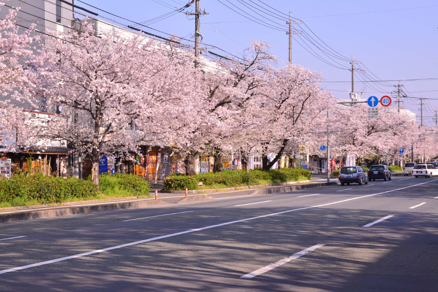 熊本市電の健軍終点から両脇に800メートルにわたって樹齢50年ほどの桜並木が続く健軍自衛隊通りは、3月下旬から4月上旬が見ごろです。4月1週目の日曜日は「健軍桜まつり」が開催され、1日限り歩行者天国となりミニライブやさまざまな露天が出店し、多くの家族連れなどで賑わいます。