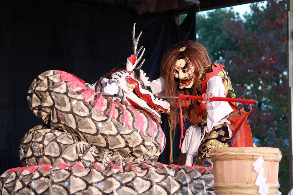 庄内神楽は江戸時代末期から伝わる伝統芸能で、比較的早いテンポにのって勇壮に、時にユーモラスに舞う様が特徴。演目は33程で、古事記や日本書紀、日本の神話や中国の易経などを題材にしたものが多く行われます。中でも見どころは「大蛇退治(おろちたいじ)」。迫力ある舞と分かりやすいストーリー、力強い太鼓の音で子供から大人まで楽しめる演目です。