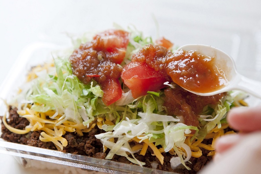 自家製サルサソースをかけてお好みの辛さに。ケチャップ不使用・トマトベースのこのソース、かなり辛い!出来立てもおいしいですが、少し時間が経つとタコスミートの味がご飯によく馴染み、さらにおいしく。ホテルに持ち帰って、夜食として食べるのもおすすめです。