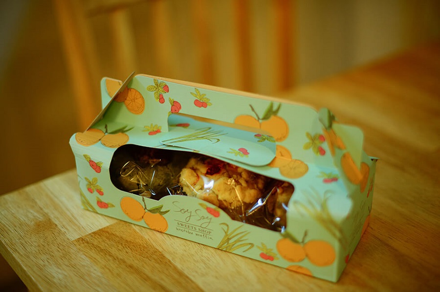 マフィンが3個入る可愛らしいオリジナルパッケージに入れれば、ギフトやおみやげにも喜ばれそう。