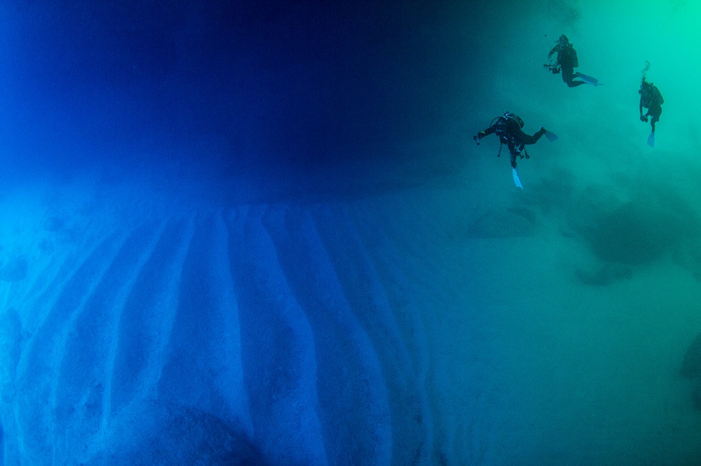 “一の穴”から島の中にある“二の穴”へ向けて潜入していく「通り池」。水は濁っていて透明度は高くありませんが、世にも美しい色彩のコントラストが見られるのが、最大の醍醐味です。いざ潜ってみると圧倒されるのが、入口の水深が22~23メートル、下の方は約45メートルというスケールの大きさ。2つの穴は地下部分で繋がっているほか、海と通じている部分もあるので、中はほぼ海水です。水中では、くっきりと分かれた緑と青の層、またはグラデーションを帯びた神秘的な層に出合えるかもしれませんよ。