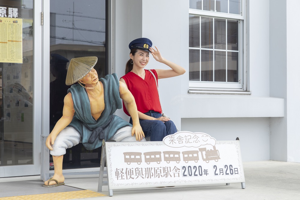 ひと通り見学した後は、駅舎前に座る馬車スンチャー(馬車引き)の “サブローおじぃ”との記念撮影をどうぞ。