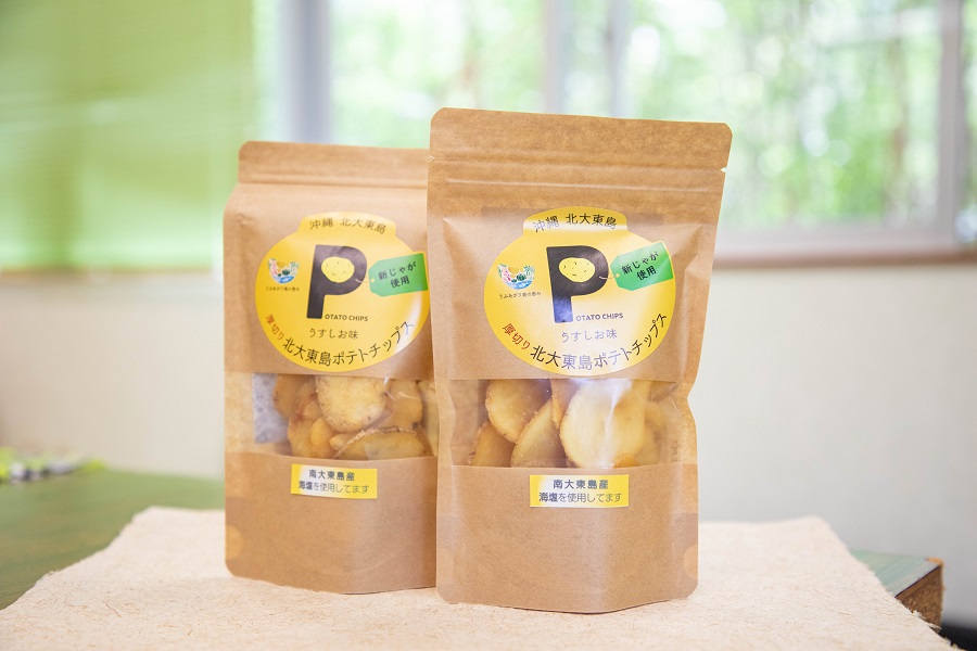 島で獲れたじゃがいも「ニシユタカ」を4月から低温保存(3℃)し、贅沢に厚切りして真空フライ製法でカラッと揚げた「北大東島ポテトチップス(うすしお味)」。