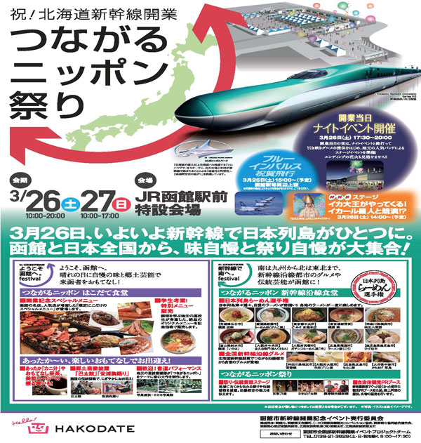 いよいよ、待望の北海道新幹線が開業!開業日の平成28年(2016)3月26日(土)と翌27日(日)に、JR函館駅前の特設会場で「つながるニッポン祭り」を開催する。