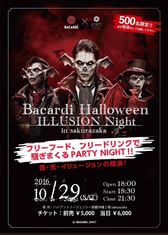 2016年10月29日(土)、那覇市桜坂エリアに建つホテル「ハイアット リージェンシー 那覇 沖縄」で、「Bacardi Halloween ILLUSION Night in sakurazaka(バカルディ ハロウィン イリュージョン ナイト イン サクラザカ)」が開催される。