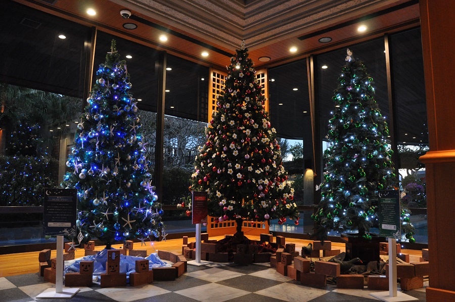 平成29年(2017)12月1日(金)~25日(月)の期間は「クリスマスキャンペーン」を実施。ロビーに3本のクリスマスツリーが並ぶほか、24日(日)のクリスマスイブの日には、オクマサンタが宿泊者の部屋をまわりプレゼントを配りますよ。