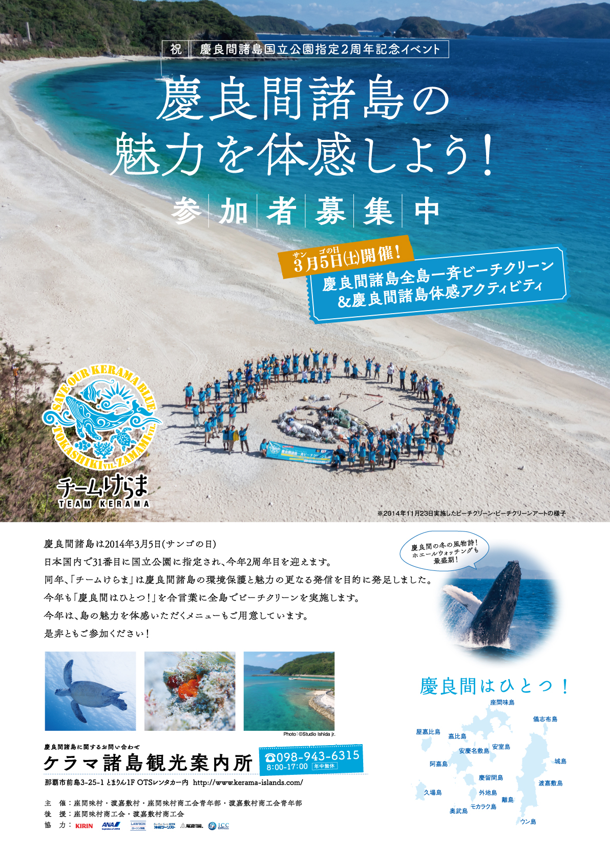 3月5日は語呂合わせでサンゴの日。慶良間諸島は平成26年(2014)の同日に日本国内で31番目となる国立公園に指定された。この美しき島の海を守って行こうと、渡嘉敷村・座間味村・渡嘉敷村商工会青年部・座間味村商工会青年部が主催となり、「慶良間はひとつ!」を合言葉に発足した「チームけらま」を結束。この「チームけらま」が中心となり毎年サンゴの日にビーチクリーンが行われている。