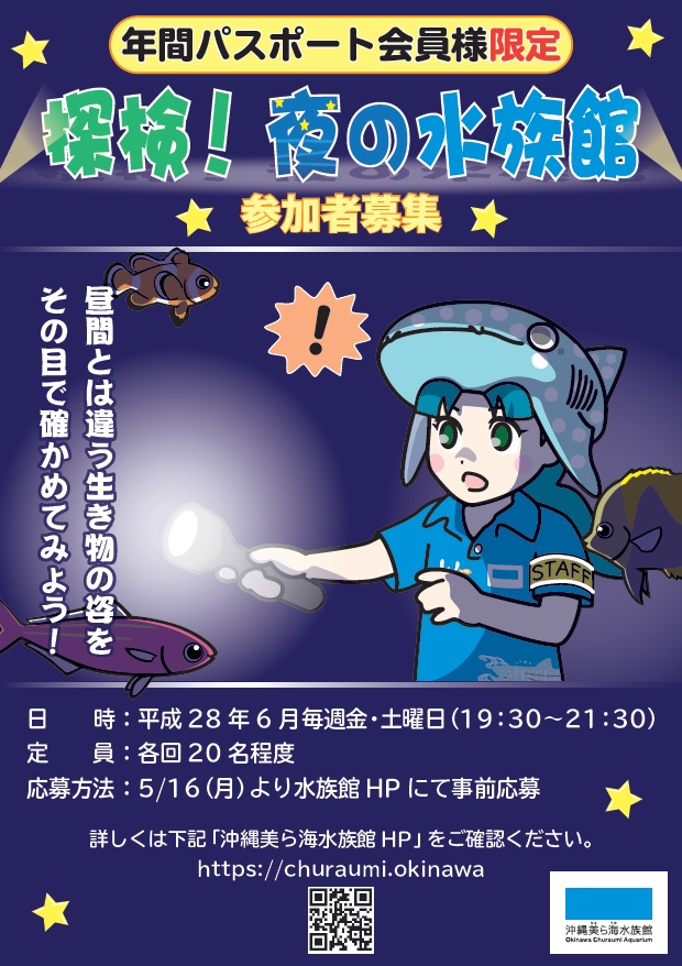 「探検!夜の水族館」は2016年6月の金・土曜日で実施。当初は1日1便だったが、好評のため1日2便に増えた。募集期間は各実施日7日前の15時まで。各回の各便定員20人程度で応募多数の場合は抽選となる。応募は沖縄美ら海水族館の公式サイトにある応募フォームで受け付けている。
