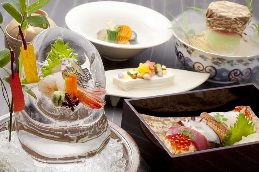 食材には車海老やグルクン(タカサゴ)、ミーバイ、石垣産和牛など、沖縄のものをふんだんに使用。天の川に見立てた「滝川豆腐」や「ちらし寿司」、短冊型の野菜をあしらった「茶碗蒸し」など、七夕をイメージした特別な会席となっている。