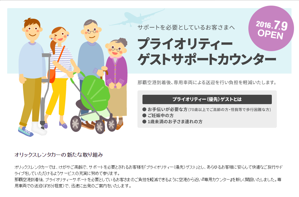 プライオリティーゲストサポート店は、国内レンタカー業界で初となるサポートを必要とするお客様専用の店舗。利用客の負担を軽減できるよう空港付近に開設した。高齢者や子ども連れを対象とし、安心・安全に沖縄旅行が楽しめるよう、那覇空港に到着後は、専用車両での無料送迎を行う。