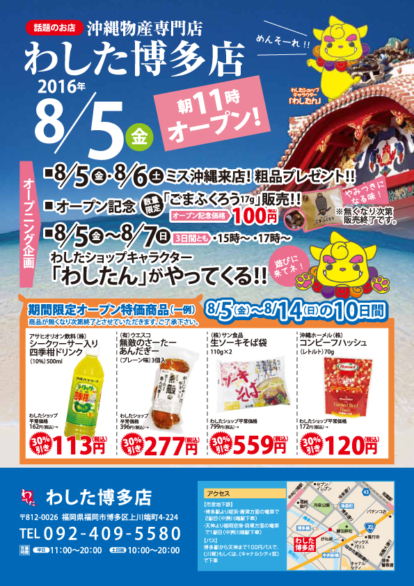 2016年8月5日(金)、福岡県博多に「わした博多店」がオープンする。わしたショップ全体では13店舗目。福岡県内では「福岡わしたショップ」があったが、諸般の事情により、平成28年(2016)5月8日に閉店していた。