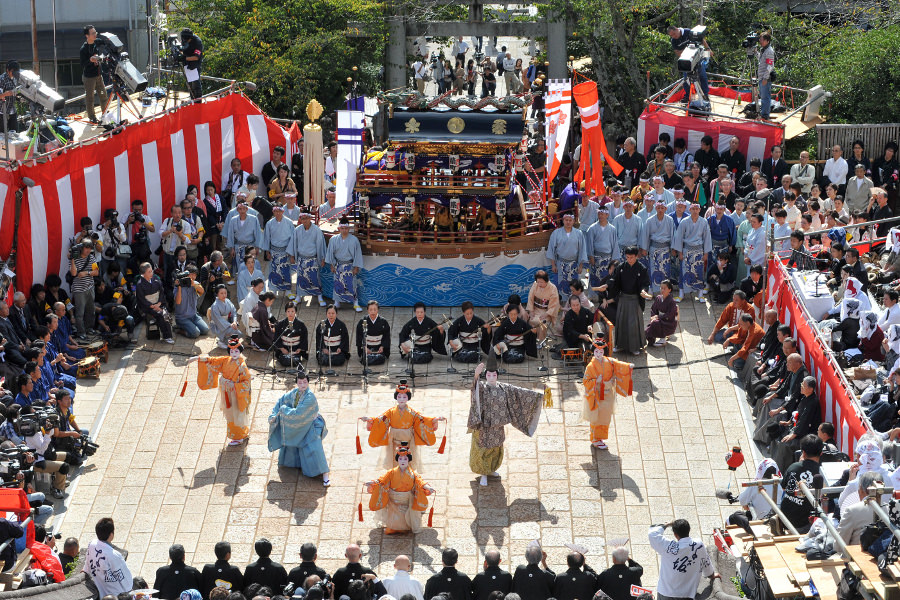 五つの踊町(おどりちょう)が華やかな踊りや、異国情緒あふれる南蛮船(なんばんせん)などの豪華絢爛な演し物を披露。このうち、竜宮船(りゅうぐうせん)を奉納する東濵町は、4トンともいわれるくんち最大級の船の船回しは圧巻で、新体操を取り入れた乙姫(おとひめ)の舞とのコントラストが見ものです。観客から「モッテコーイ」という大歓声が上がると、アンコールが行われます。