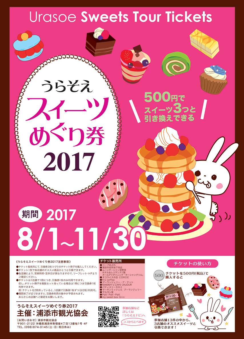 沖縄県本島中部の浦添市(うらそえし)では、平成29年(2017)8月1日(火)から浦添市内でお得にスイーツが楽しめるチケット「うらそえスイーツめぐり券2017」が販売されます。
