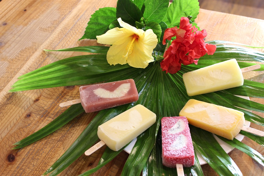 石垣島市内の商店街、ユーグレナモールのアーケードを出たところにある「フルーツジュエリーファクトリー」は、石垣島産のパイナップルやドラゴンフルーツなどを丸ごと使ったアイスバーやスムージーが人気の店。添加物や甘味料などを使わずにフルーツの良さを引き出すこだわりの製法で、食べた後に爽やかな余韻を残す「フルーツアイスバー」は、店内の奥で手作りし急速冷凍で仕上げています。