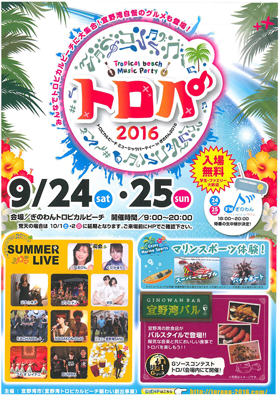 2016年9月24日(土)、25日(日)の2日間、沖縄県本島中部の宜野湾市(ぎのわんし)で「トロピカルビーチミュージックパーティー トロパ2016」が開催される。
