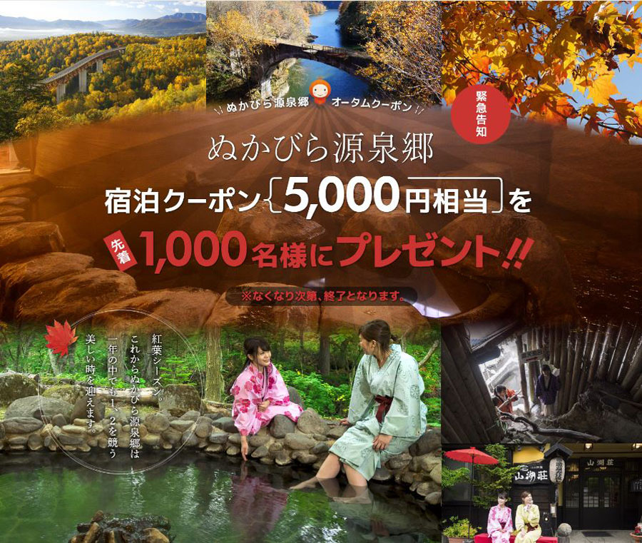 南大雪地方・上士幌町(かみしほろちょう)の「ぬかびら源泉郷」が、9月26日(月)からオータムクーポンを発行。5000円相当の宿泊クーポンを、先着1000人にプレゼントする予定だ。