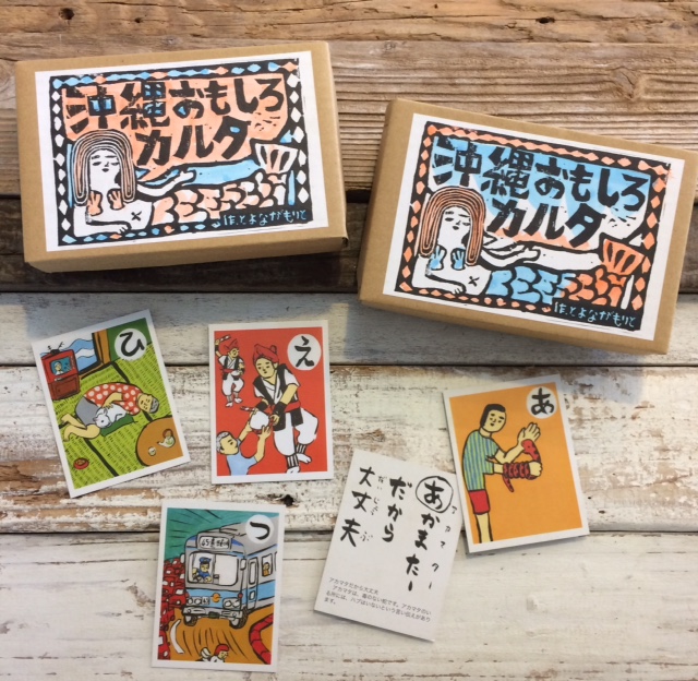 ユニークな絵柄が目を引く「沖縄おもしろカルタ」は、琉球張り子作家の豊永盛人さんの作品。その名の通り沖縄の文化を面白い視点で表現し、沖縄方言も一緒に学べます。平成20年(2008)9月18日「島言葉(琉球方言)の日」に沖縄県立美術館のイベント用の作品として展示したことがきっかけで、那覇市にあるお店「玩具Road works」で販売されています。