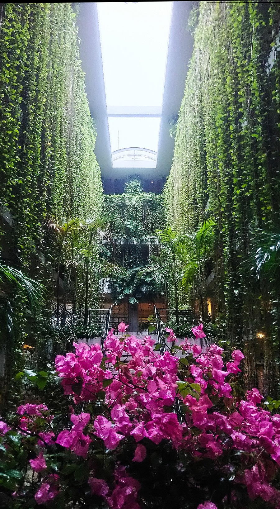 同ホテルは建築家で国建名誉会長の国場幸房氏が設計を手掛け、昭和50年(1975)に完成。ピロティや吹き抜けが取り入れられ、客室から一歩出ると、そこには光が差し込み、時には雨も降り落ちる自然の空間が広がっています。