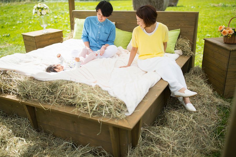 大人3人ほどが横になれる牧草ベッドの周りには、牧草ロールや牧草ベンチも。大自然の真ん中にあるので、思いきり走り回ってもOK。青空の下で牧草ならではのフカフカとした感触と優しい香りのベッドに大の字で寝転べば、この上ない開放感が味わえます。