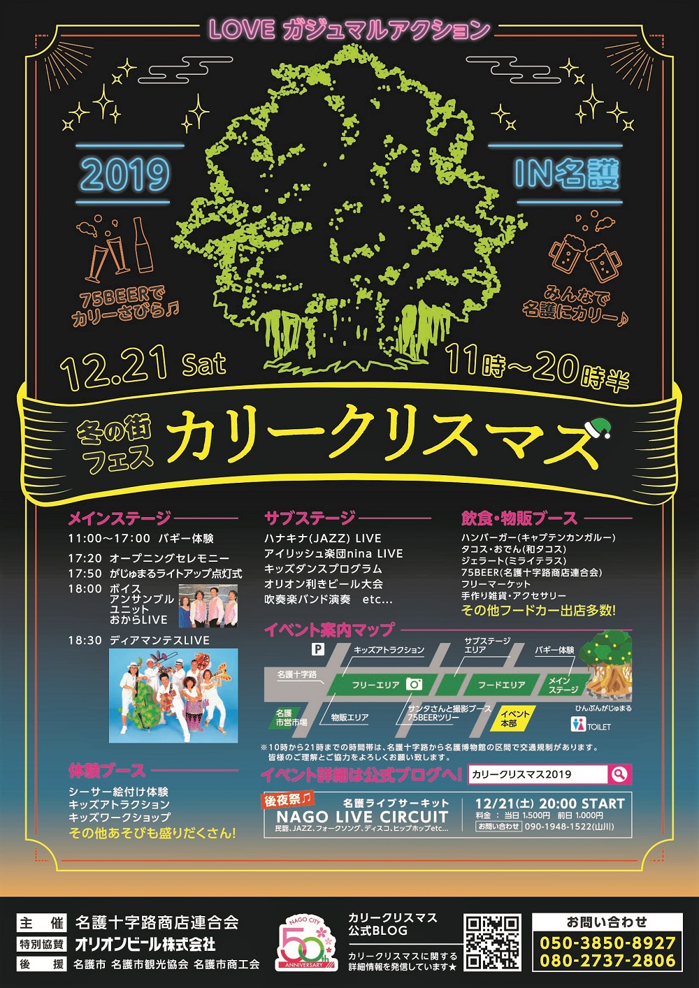 がじゅまる前のメインステージでは、バギー体験やヴォイスアンサンブル、沖縄の人気アーティスト「ディアマンテス」によるライブ、夕方17時30分からは、名護市の名物である「ひんぷんガジュマル」のライトアップなど多彩な催しが行われます。