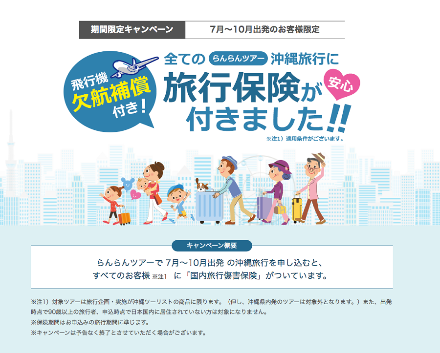 「らんらんツアー」で平成30年(2018)7月~10月出発の沖縄旅行を申し込むと「航空機欠航・遅延補償付き国内旅行傷害保険」が自動付帯されます。旅行中のケガによる入院、通院はもちろん、賠償事故や手荷物の盗難まで、幅広く補償が付いています。