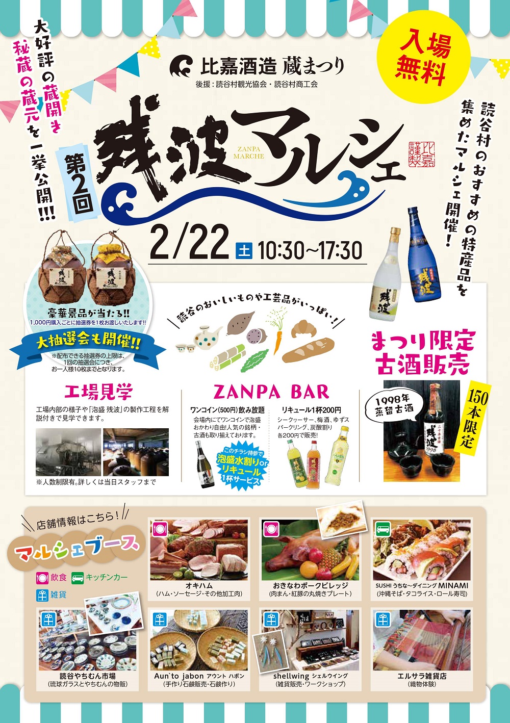 また、地元読谷村事業者による飲食や雑貨コーナーの他、抽選会、ステージイベント、ZANPA BARでのワンコイン飲み放題、人気の銘柄や古酒の販売も会場内で行われます。