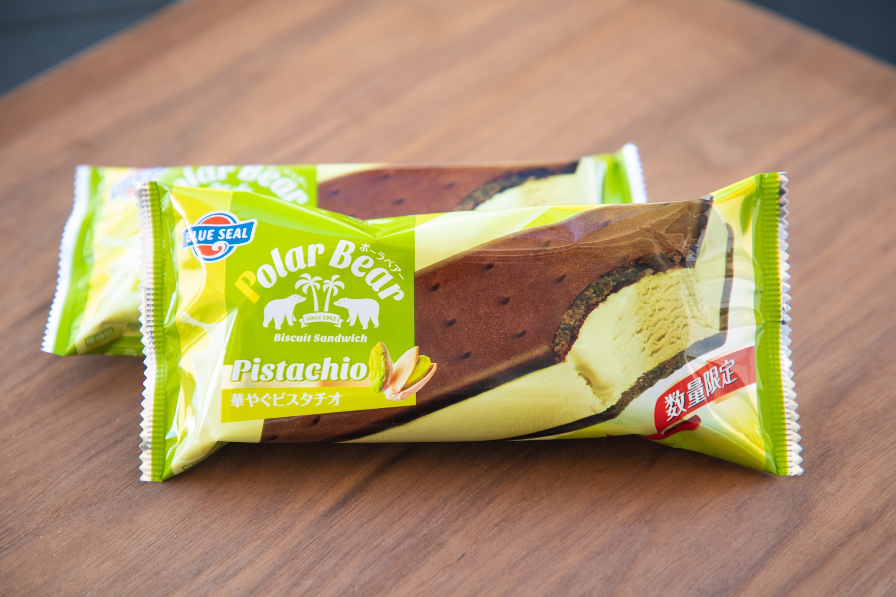 アイスの部分には、ローストピスタチオのペーストを使用。ひと口味わえば、ピスタチオの風味がふわりと広がります。また、沖縄県産のきび糖を使用し、コクをプラス。ポーラベアーの特徴である、ココアビスケットでサンドされたアイスは、優しい甘さで大人はもちろん子どもにもおすすめです。