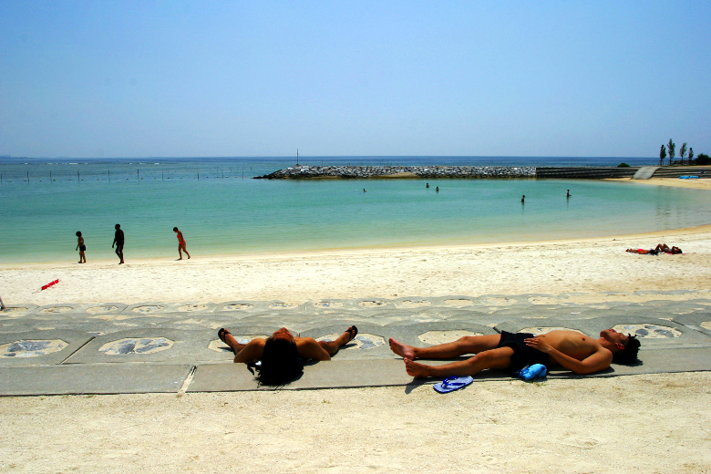 写真は「サンセットビーチ」。 ぴっかぴかに輝く沖縄の太陽の下で、友人と日光浴するのは素晴らしく気持ちが良いはずです。彼らには海水浴客の喧噪も子守唄に聞こえているかもしれません。開放感いっぱいの亜熱帯の海辺は、普段の生活で溜め込んだストレスを発散するためにあります。しかし、このあと彼らは気がつくでしょう。太陽の強烈な日差しは本土とは違うことに。でも、真っ赤になった肌を沖縄土産に持ち帰ると、あのまばゆい沖縄の太陽の思い出が蘇ります。そして、また戻りたくなるに違いありません。