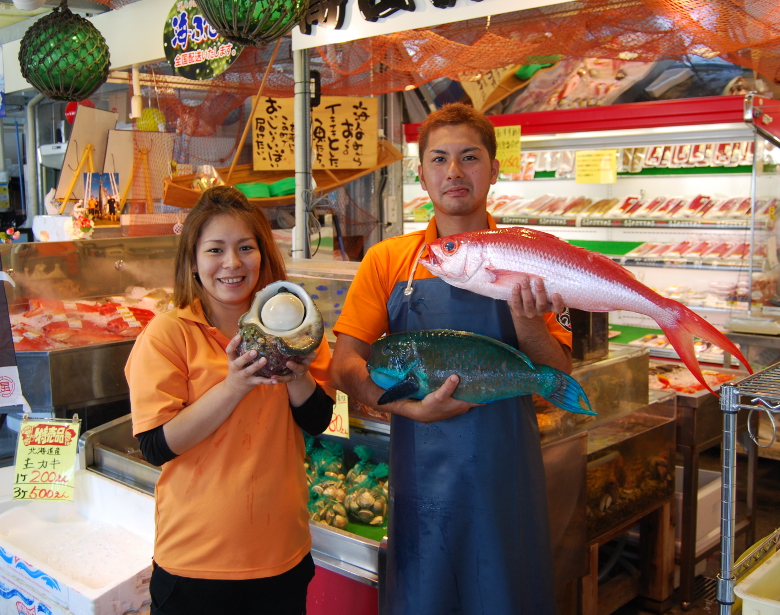 「お魚センターにも、珍しい魚が並ぶんですよ。スッポンやウツボ、アカマンボウにセミエビ。サメがまるごと1匹店頭に並んだときにはびっくりしました」。「お魚センター」内の店舗は、県内各地の漁協の競り権を持っている人がいるため、地域を限定せずいろいろな海産物が手に入ります。宅配サービスを利用すれば、気軽に沖縄ならではの生鮮品を土産にできます。