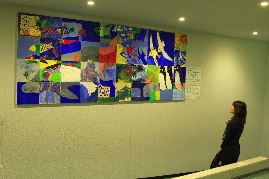 1階の展示も最終にさしかかる「サンゴ礁のサカナたち」の円柱型の水槽を抜けると、色とりどりの魚たちが描かれた壁画が現れる。こちらは平成24年(2012)にサンピアザ水族館30周年を記念し、動物の絵で人気の絵本作家・あべ弘士氏と、40名の子どもたちの共同制作によるもの。サンピアザ水族館を題材に、枠組みをあべ氏が描き、その中に水族館の生き物を、子どもたちが自由に描いた大作だ。2階へ続く階段を上る前に、ぜひ足を止めて眺めてみて。いきいきとしたタッチで描かれた生き物たちの様子に、心が弾む作品に仕上がっている。